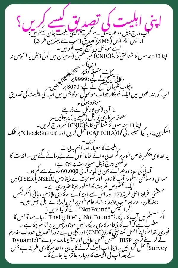 Send your 13-digit CNIC number to 9999 or 8070. You will receive an automated message confirming your eligibility.